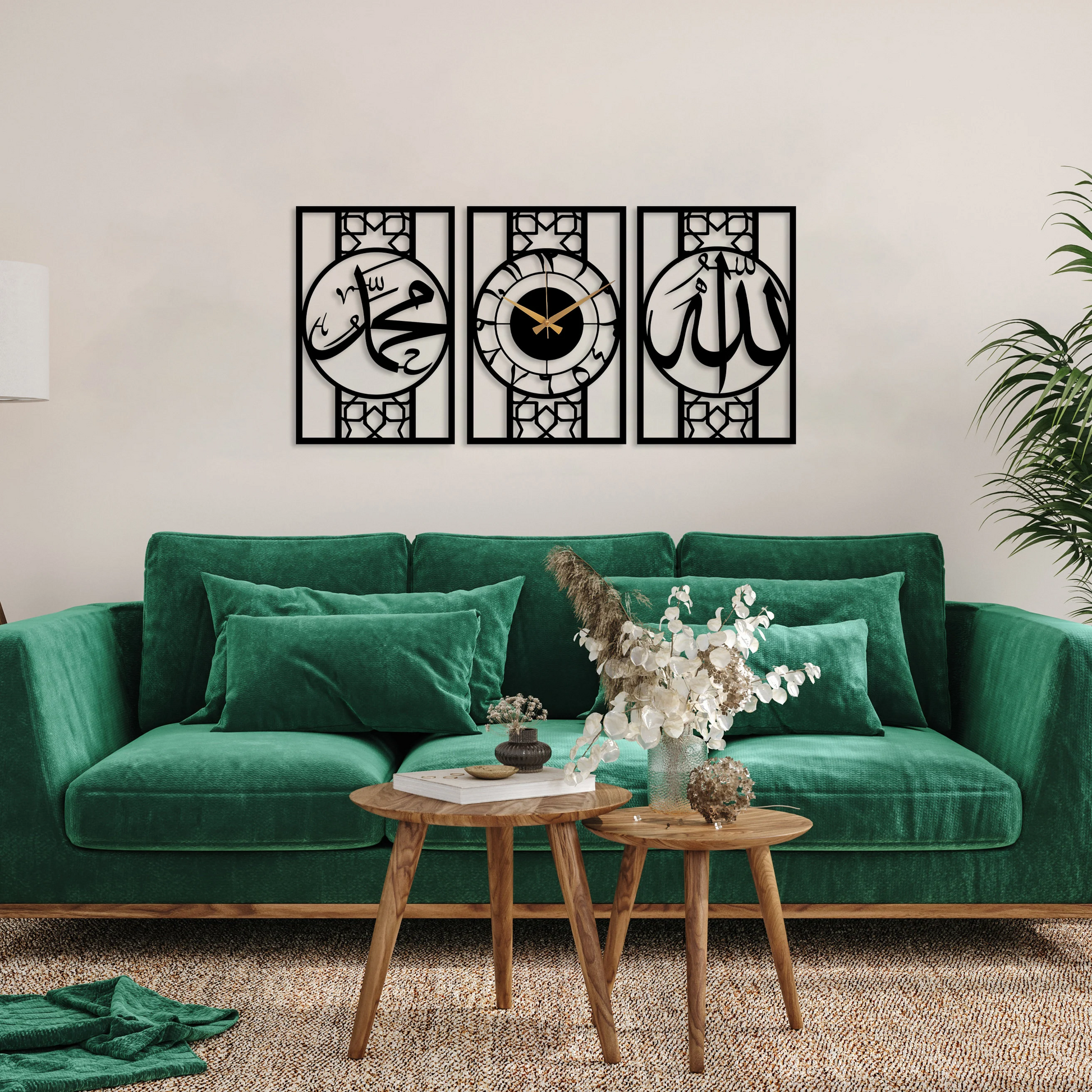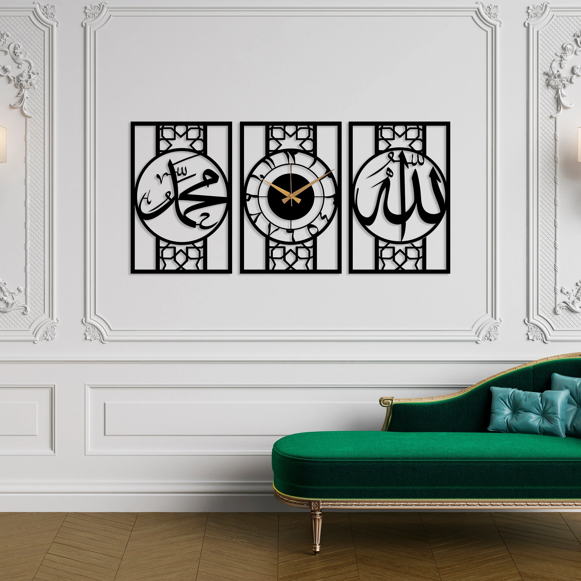 Islamic Metal Wall Art Set of 3 – Allah, Muhammad & Wall Clock